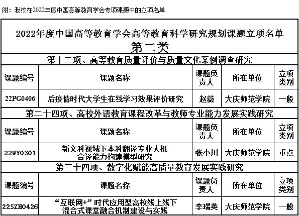 近日,中国高等教育学会公布2022年度中国高等教育学会高等教育科学研究规划课题立项名单,我校3个项目获批立项。赵微老师主持的《后疫情时代大学生在线学习效果评价研究》获批“高等教育质量评价与质量文化案例调查研究”专项一般项目,张小川老师主持的《新文科视域下本科翻译专业人机合译能力构建模型研究》获“高校外语教育课程改革与教师专业能力发展实践研究”专项重点项目,李瑞英老师主持的《“互联网+”时代应用型高校线上线下混合式课堂融合机制建设与实践》获“数字化赋能高质量教育发展实践研究”专项一般项目。