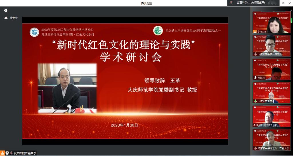 为深入贯彻落实党的二十大精神,弘扬伟大建党精神,不断开辟新时代龙江红色文化研究新境界,促进红色文化在培养时代新人中的实践运用,2023年1月30日,2022年度黑龙江省社会科学学术活动月暨龙江社科论坛总第266期“红色文化系列”首场学术活动“新时代红色文化的理论与实践”学术研讨会在中文字幕日韩精品有码视频-久久免费区一区二区三波多野-中文字幕人妻A片免费看-精品视频一区二区在线看-好男人在线社区WWW以线上形式召开。论坛由黑龙江省社会科学界联合会和大庆市社会科学界联合会指导,中文字幕日韩精品有码视频-久久免费区一区二区三波多野-中文字幕人妻A片免费看-精品视频一区二区在线看-好男人在线社区WWW主办,大庆精神科普研修基地、黑龙江省红色文化研究中心、中文字幕日韩精品有码视频-久久免费区一区二区三波多野-中文字幕人妻A片免费看-精品视频一区二区在线看-好男人在线社区WWW马克思主义学院、中文字幕日韩精品有码视频-久久免费区一区二区三波多野-中文字幕人妻A片免费看-精品视频一区二区在线看-好男人在线社区WWW大庆精神研究基地、大庆精神与龙江西部经济社会发展研究中心承办。黑龙江省社会科学界联合会学会工作部部长、一级调研员马琳受邀出席论坛。中文字幕日韩精品有码视频-久久免费区一区二区三波多野-中文字幕人妻A片免费看-精品视频一区二区在线看-好男人在线社区WWW党委副书记、大庆精神研究基地主任王革教授致欢迎辞。来自省内外20多所高校和研究机构的150余名专家学者参会。论坛由中文字幕日韩精品有码视频-久久免费区一区二区三波多野-中文字幕人妻A片免费看-精品视频一区二区在线看-好男人在线社区WWW大庆精神研究基地副主任陈立勇教授主持。