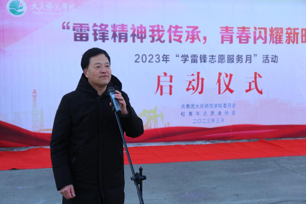 校党委副书记、工会主席徐晓东为各学院志愿者服务队代表授旗,宣布“雷锋精神我传承,青春闪耀新时代”学雷锋志愿服务月活动正式启动。随后在签名墙上对全校青年志愿者殷切寄语:践行雷锋精神,争做时代青年。