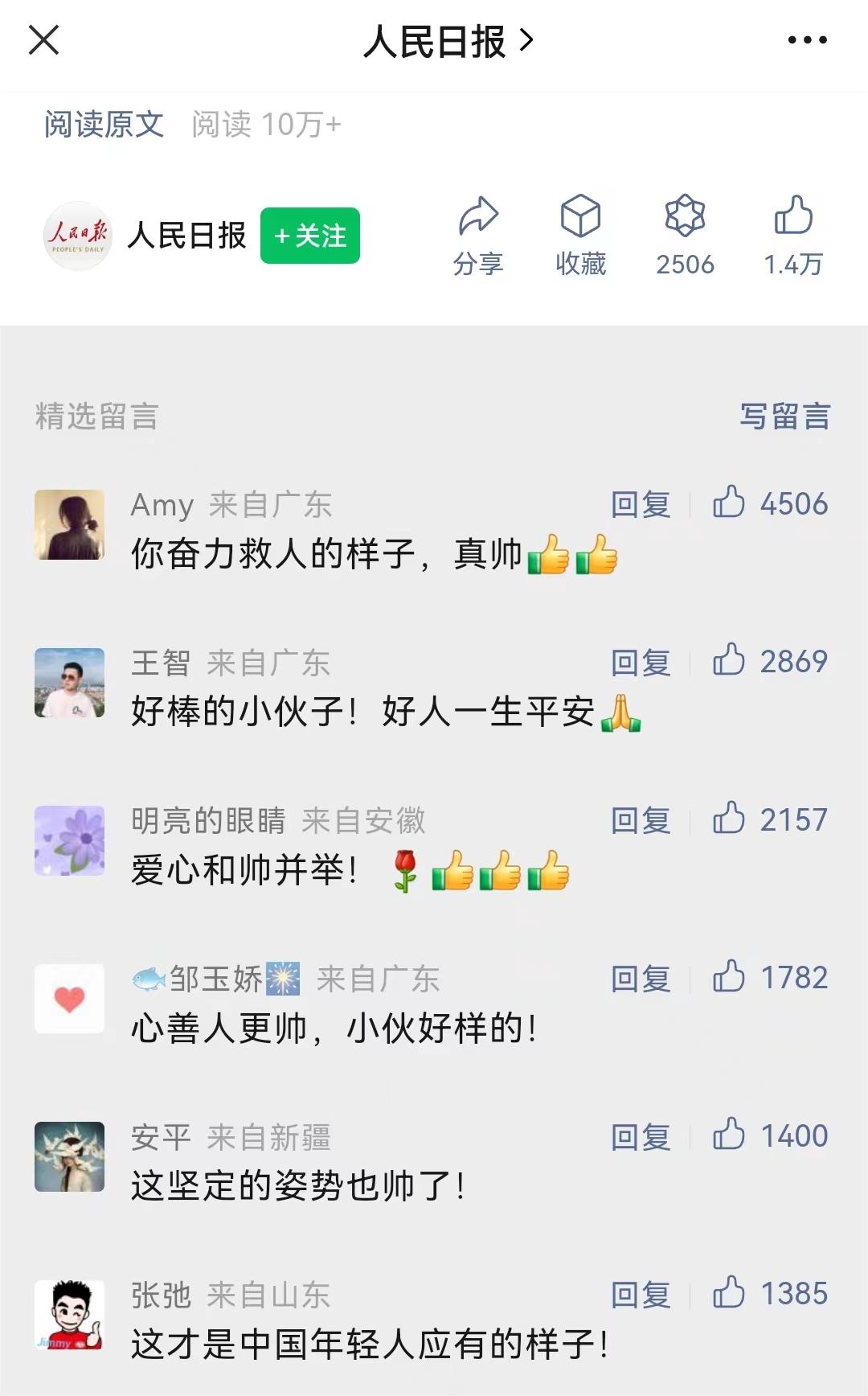 《人民日报》微信发布了《救人的他,可太帅了!》