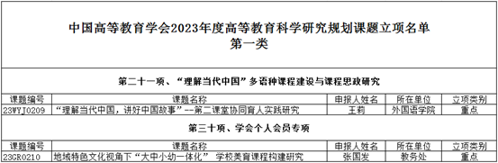 中国高等教育学会5月份启动2023年度高等教育科学研究规划课题后,教务处和各学院精心组织,共18项课题参与立项申报,经专家评审后推荐16项课题。经中国高等教育学会专家评审,外国语学院王莉老师主持申报的《“理解当代中国,讲好中国故事”--第二课堂协同育人实践研究》获批“理解当代中国”多语种课程建设与课程思政研究专项重点项目;教务处张国发老师主持申报的《地域特色文化视角下“大中小幼一体化” 学校美育课程构建硏究》获“学会个人会员专项”重点项目。