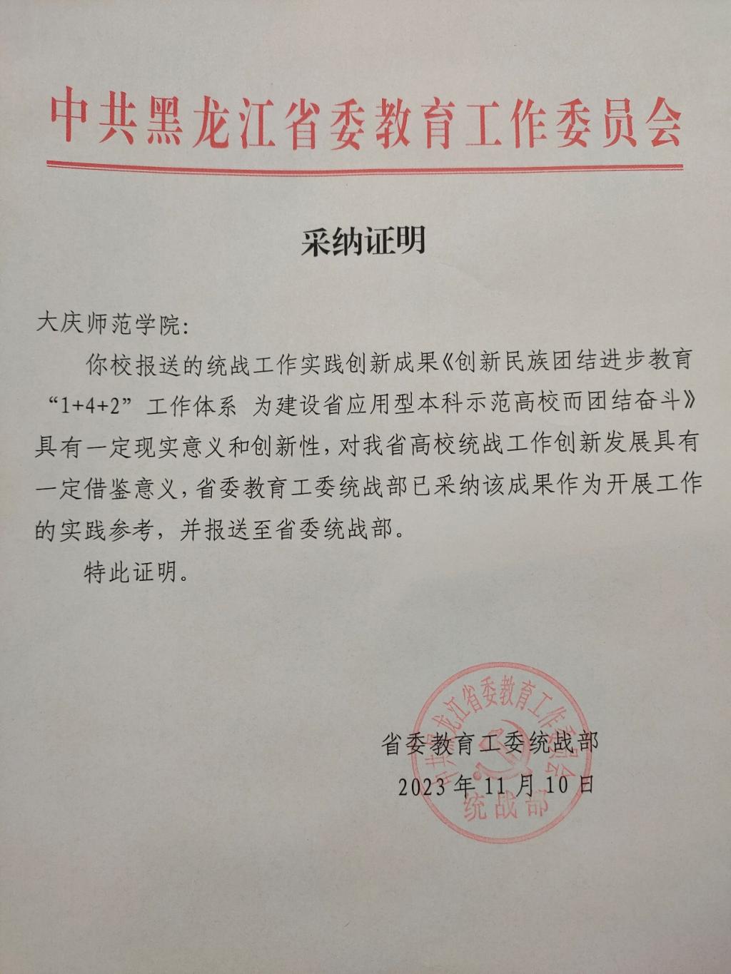 近日,由宣传统战部报送的统战工作实践创新成果《创新民族团结进步教育“1+4+2”工作体系 为建设省应用型本科示范高校而团结奋斗》被省委教育工委统战部采纳,作为创新开展统战工作的实践参考,并报送至省委统战部。(宣传统战部供稿)