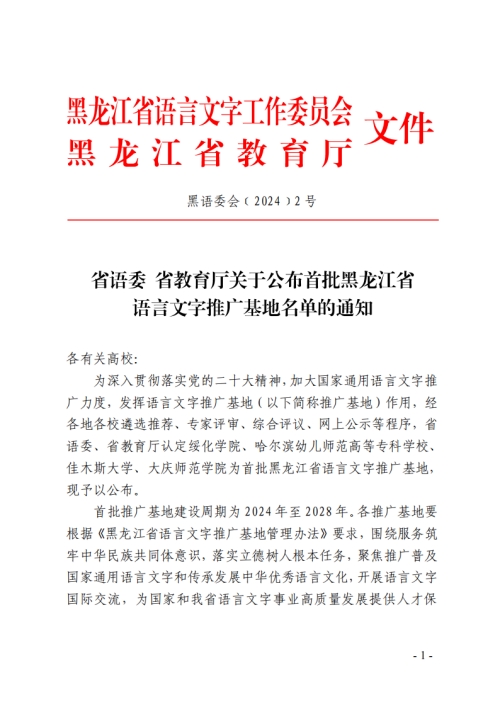 近日,黑龙江省语言文字工作委员会、黑龙江省教育厅下发《关于公布首批黑龙江省语言文字推广基地名单的通知》,经遴选推荐、专家评审、实地考察、综合评议、网上公示等程序,我校被认定为首批黑龙江省语言文字推广基地。