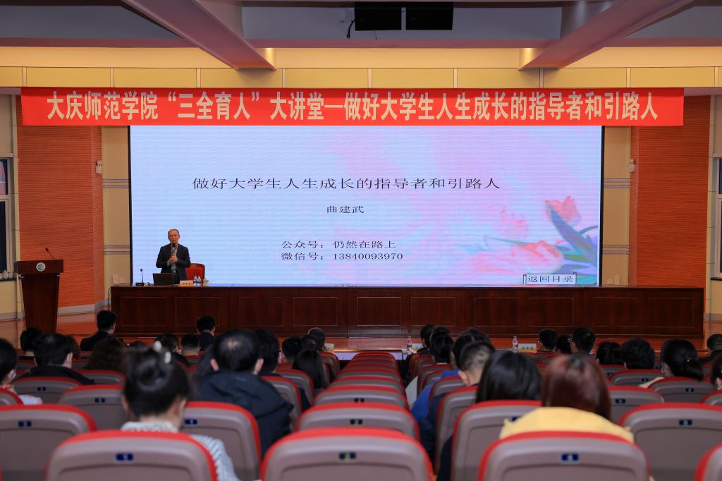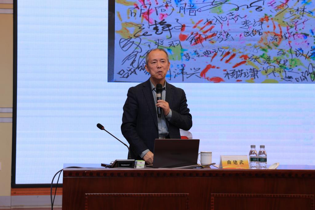 曲建武教授围绕“做好大学生人生成长的指导者和引路人”这个主题,从不忘初心使命、增强政治意识之心、倾力铸魂育人等方面,结合自己丰富的人生阅历和四十余年的育人经历,用温馨感人的照片、情真意切的信函和关爱、引领学生成长的案例,深情回顾自己积极践行铸魂育人使命的历程,分享了高校辅导员工作的重要性和对做好大学生思想政治教育工作的思考与感悟。