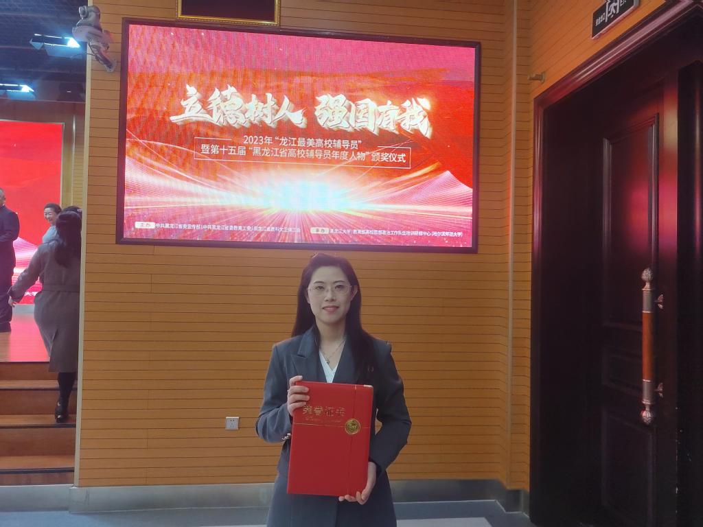 3月26日上午,由中共黑龙江省委宣传部、中共黑龙江省委教育工委、黑龙江省教科文卫体工会主办的2023年“龙江最美高校辅导员”暨第十五届“黑龙江省高校辅导员年度人物”颁奖仪式在黑龙江大学举行。省委宣传部、省教育厅等领导出席活动并颁奖。我校美术与设计学院辅导员汪丽媛被授予“黑龙江省高校辅导员年度人物”荣誉称号,这是我校辅导员首次荣获该项殊荣。
