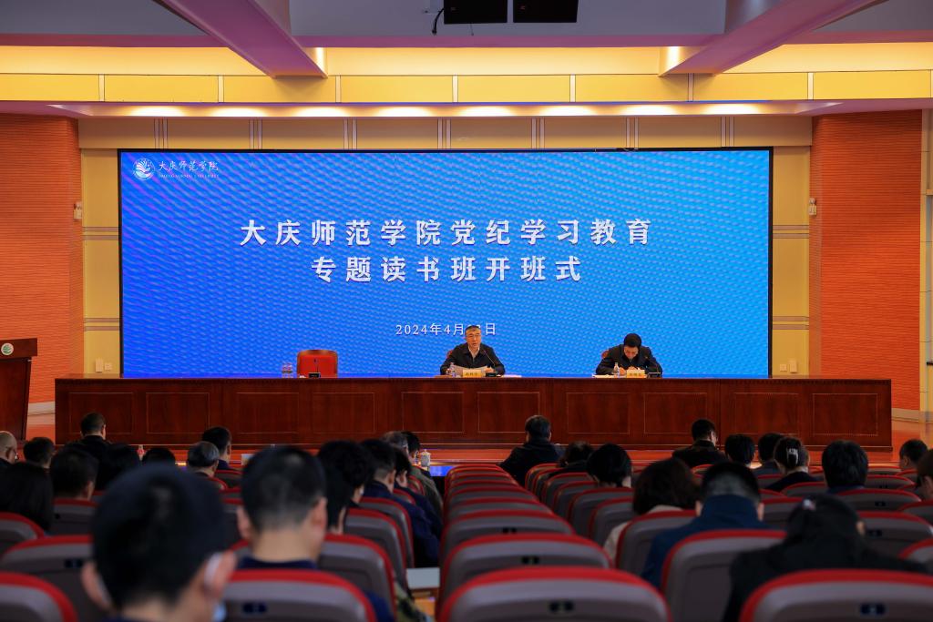 4月23日上午,我校在博雅讲堂召开党纪学习教育专题读书班开班式。校领导、全校副处级以上干部参加开班式。党委书记赵科学作开班讲话,开班式由党委副书记、工会主席徐晓东主持。