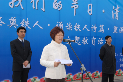 缅怀祭奠仪式上,大庆市文明办主任梁华同志致辞。她说,今天,我们怀着崇敬的心情,在铁人塑像前隆重集会,共同来开启“缅怀祭奠铁人、诵读铁人诗篇、重温铁人誓言”主题教育活动的序幕。她强调,大庆精神铁人精神是以王进喜同志为代表的老一代石油工人创造的宝贵精神财富,是我们这座城市的灵魂。继承和弘扬大庆精神铁人精神是我们永恒的主题。她希望,广大学子切实增强 “爱祖国爱大庆”情感,激发其感恩先人、回报社会的情怀,树立正确的世界观、人生观、就业观和奉献观,努力践行大庆精神铁人精神的继承者和传播者。