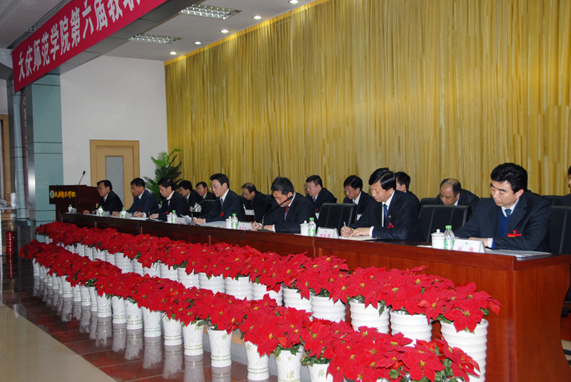 闭幕式上,大庆油田有限责任公司副总经理、管理局副局长、党委常委、学院党委书记齐振林同志作了题为“面向油田面向社会面向未来努力把学院建设成为高质量高水平本科院校”的重要讲话。他予以大会充分肯定,就深入贯彻落实会议精神,如何加强高质量高水平本科院校建设,强调三点意见:一是认清形势,统一思想,努力形成推动高质量高水平本科院校建设的强大动力。他说,学院正处于一个内外部环境的深刻变化之中,宏观环境在变,学校自身在变,发展的要求在变。全校各级党政组织和广大教职工要充分认清这种变化,主动适应这种变化,在因势利导、趋利避害中扎实推进合格本科院校建设。二是把握定位,理清思路,努力形成高质量高水平本科院校建设的新格局。他指出,在办学定位上,要面向油田,面向社会,面向未来,着力打造精品型、特色化学校;在教育教学和管理上,要突出教学中心地位,着力提高教学和人才培养的质量;在服务社会上,要立足油田、依托油田、服务油田,成为油田和地方科技创新、人才培养的重要力量;在大学精神培育上,要成为大庆精神、铁人精神的传承地。三是发挥优势,服务大局,努力形成高质量高水平本科院校建设的整体合力。他强调,要大力加强学习型党组织建设,提升引领学校发展的能力;要大力加强领导班子和干部队伍建设,提升办学治校的能力;要大力加强教师队伍建设,提升教书育人的能力;要大力加强对群团组织的领导,提升群众工作的动员力和感召力。最后,他鼓舞大家说,各级党政组织和广大教职工要坚持以科学发展观为指导,深入贯彻落实会议精神,解放思想,开拓进取,团结一心,携手奋斗,不断开创学校科学发展和谐发展的崭新局面,以优异成绩向建校45周年献礼!