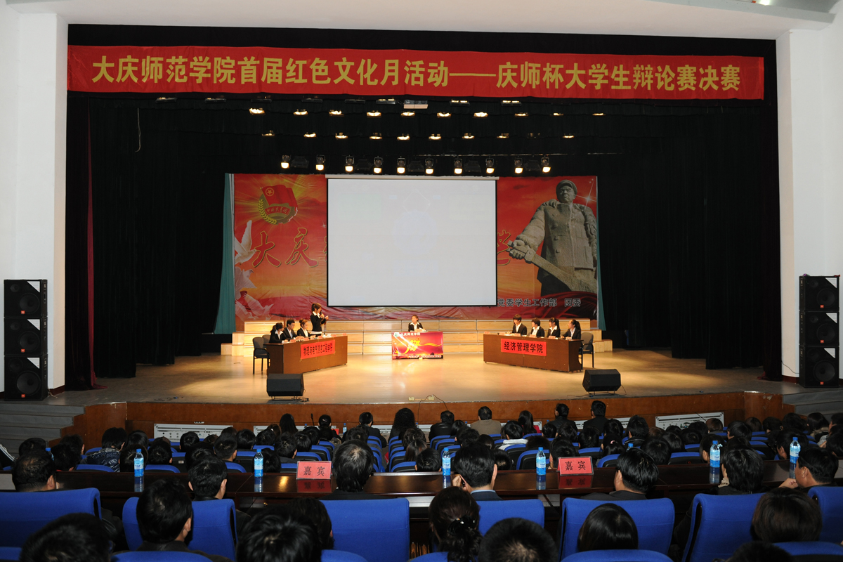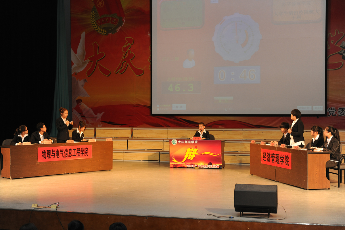 11月3日晚,由校团委主办,经济管理学院、法学院承办的 “庆师杯大学生辩论赛”决赛在大学生活动中心举行,物理与电气工程学院、经济管理学院,数学科学学院、外国语学院代分别进行了主题辩论。