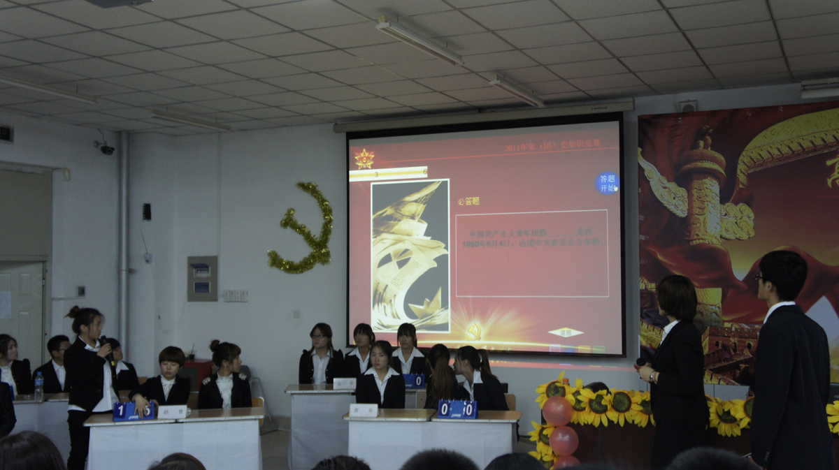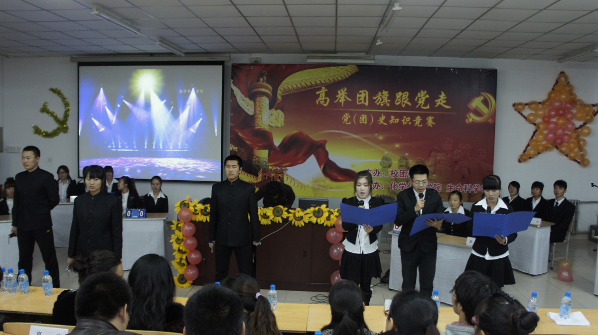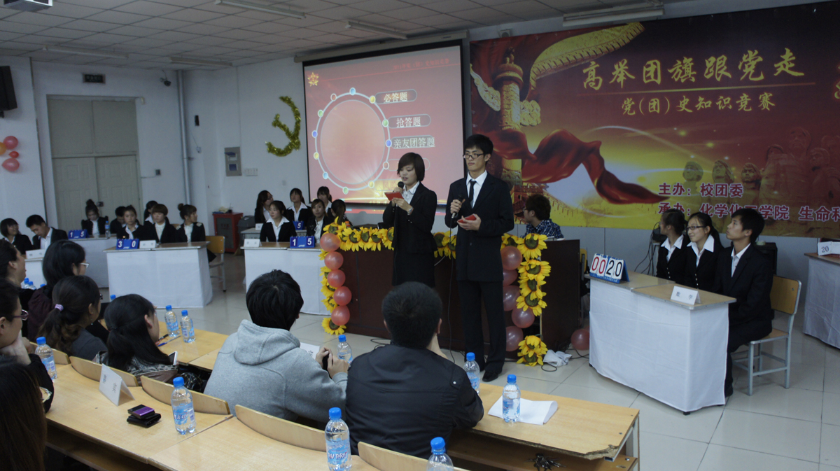 10月19日下午,我校在主楼1-1举行了以"高举红旗跟党走"为主题党(团)史知识竞赛。各院系学生党支部书记、辅导员及学生代表200余人观看了比赛。来自生命科学学院,数学科学学院,化学化工学院,经济管理学院,计算机科学与信息技术学院,教育科学学院,文学院,艺术学院音乐系等九支代表同场竞技,一展风采。