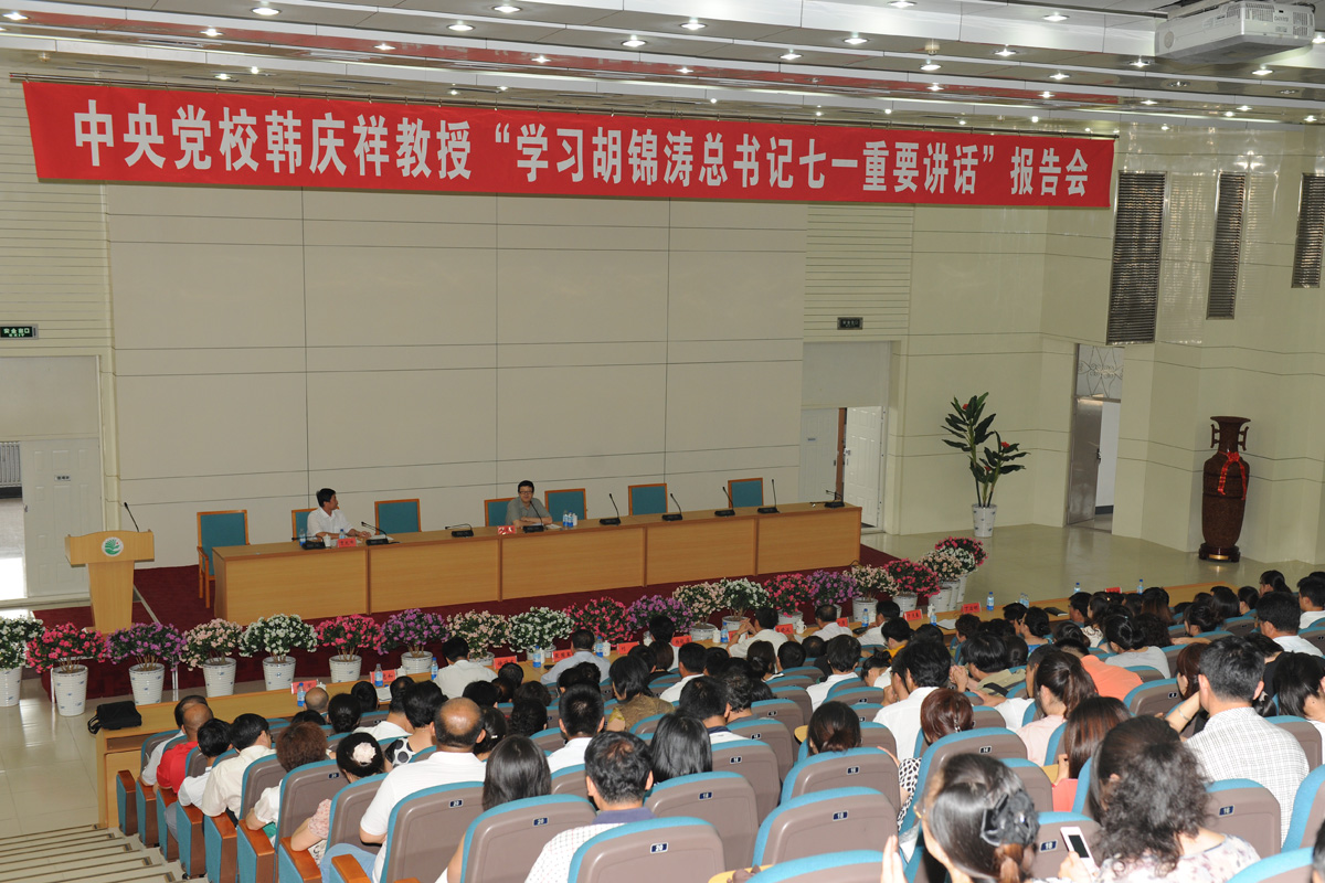 7月18日下午,我校召开中心组学习扩大会议,邀请中央党校韩庆祥教授作题为“学习胡锦涛总书记七一重要讲话”的专题报告。学校副总师以上领导、教职工代表、学生代表600余人聆听了报告。报告会由党委副书记贾文涛主持。