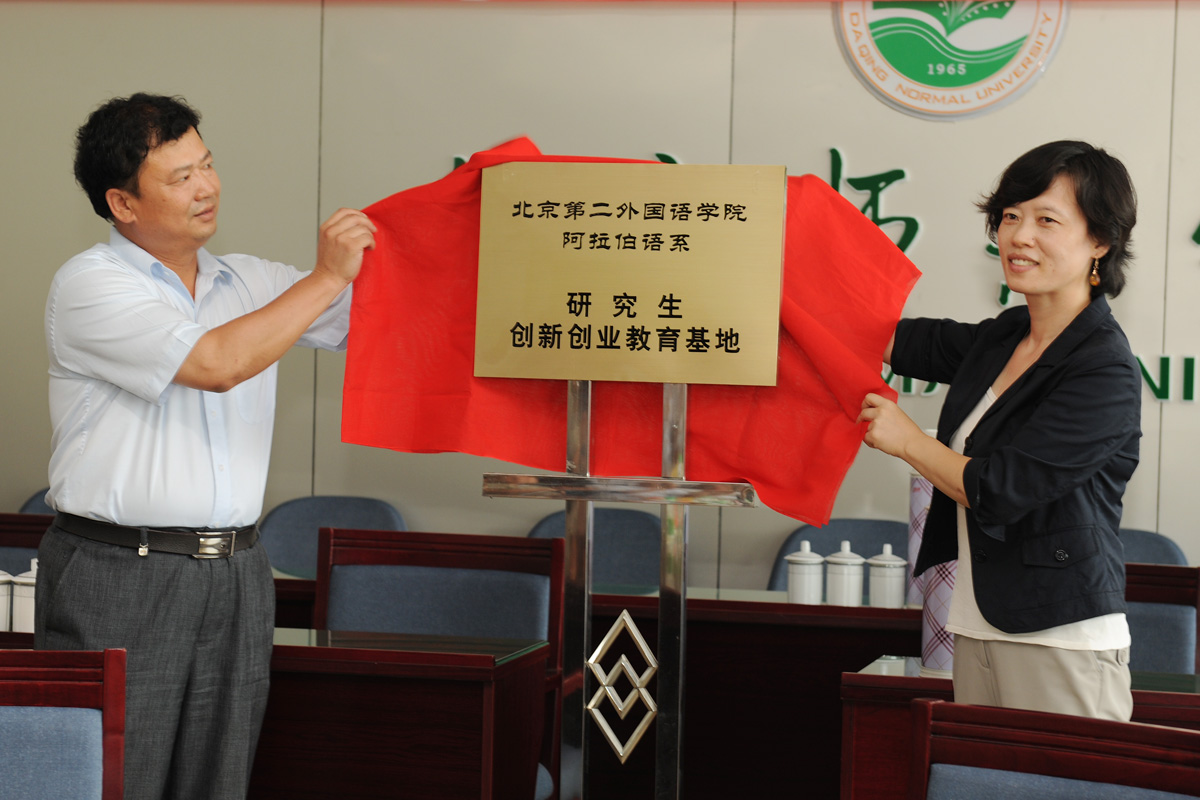 欢迎仪式后,外国语学院院长葛建民与北京第二外国语学院阿拉伯语系主任李宁在协议书上签字并为教育基地揭牌。