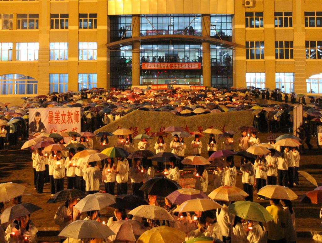 “今天我们在这里隆重集会,为我校文学院2007届毕业生张丽莉同学祈福。”5月13日晚7点30分,学校自发组织烛光祈福活动,在雨中为勇救学生的“最美女教师”张丽莉祈祷。