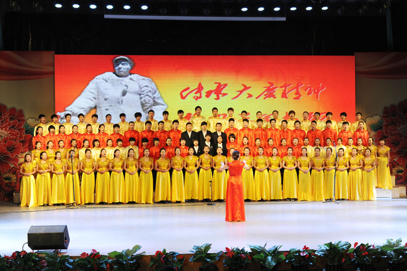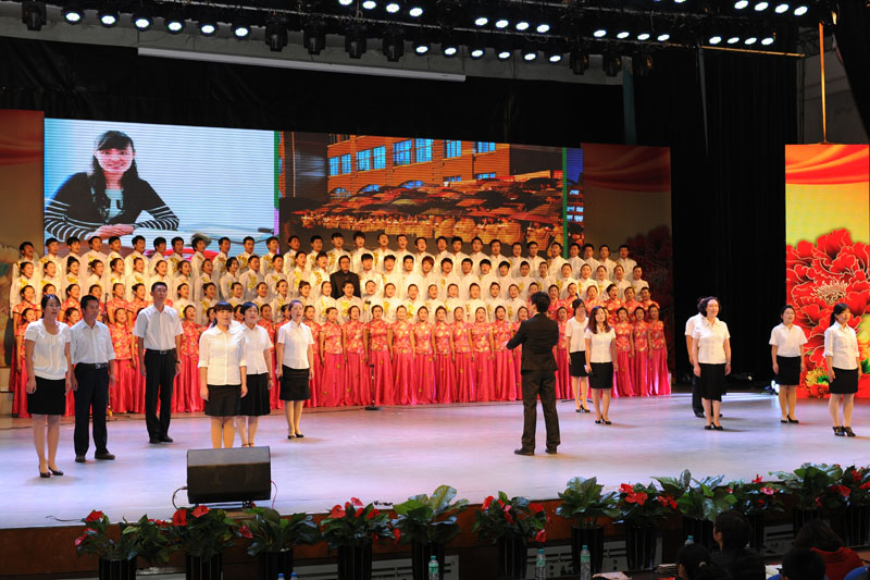 比赛在教育科学学院的原创歌曲《百湖之歌》中拉开帷幕。学校十三个院系师生同台演唱,一曲曲红色经典歌曲再次被唱响。