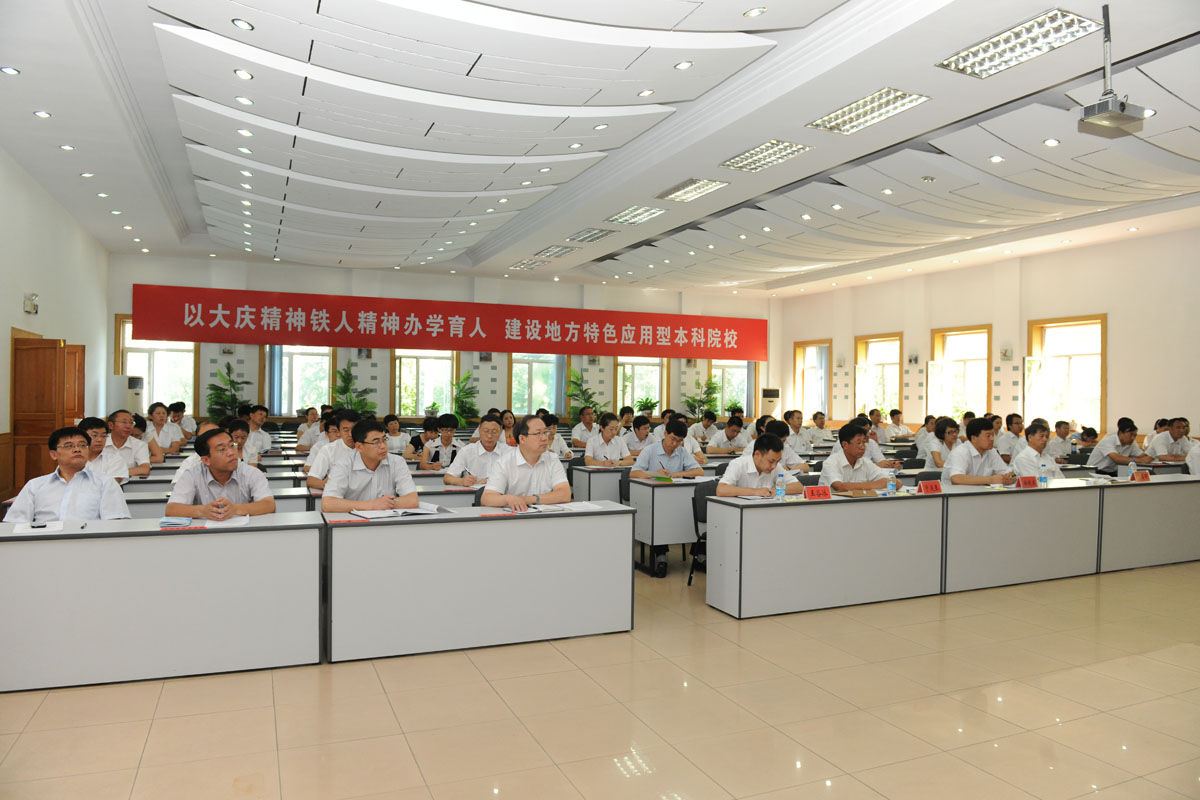 校长徐克明同志主持会议,校党委副书记、纪委书记王革同志代表校党委做动员讲话,油田党委党的群众路线教育活动领导小组第一督导组组长宋传修代表督导组讲话。