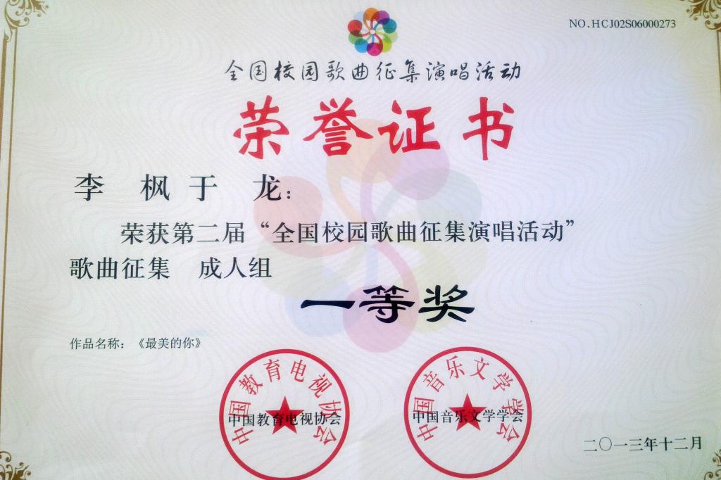 近日在深圳广电总局举办的第二届全国校园歌曲征集演唱活动颁奖盛典上,由我校文学院教师李枫作词、音乐与舞蹈学院教师于龙作曲的合唱作品《最美的你》,在380多首原创歌曲中脱颖而出,夺得一等奖,我校获得组织工作先进单位。