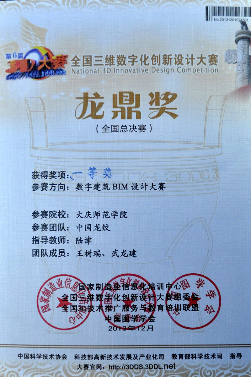12月6日,2013年“3D大赛”全国总决赛在江苏常州科教城开赛。我校微电影作品《梦境神游》和数字建筑BIM设计作品《简阁》参加了现场决赛。经过答辩、评委提问、作品比较和终审等环节,《简阁》获得数字建筑BIM设计类一等奖,《梦境神游》获微电影方向类二等奖。