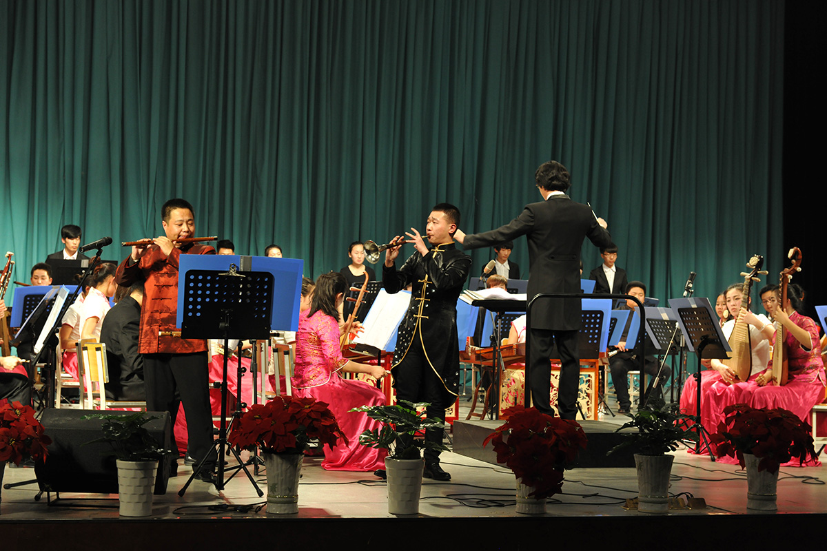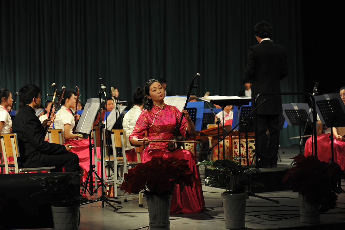 演出在民乐合奏《龙腾虎跃》中拉开帷幕,乐曲情绪炽热,民族风味浓厚,欢快的鼓乐在民族乐器的烘托下,再现了气势壮阔的欢腾场面。《长城随想曲》、《爱情》、《抒情变奏曲·第三乐章》、《喜奔那达慕》、《长白山歌》等极具时代特征和浓郁民族风格的经典曲目的演奏,带领学生们走进了奇妙的音乐殿堂,领略了民族音乐的无穷魅力,享受了一场丰盛的音乐盛宴。