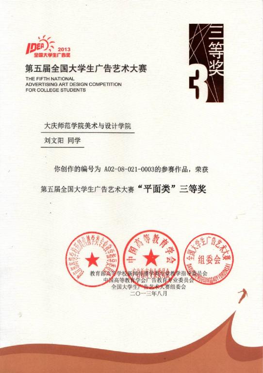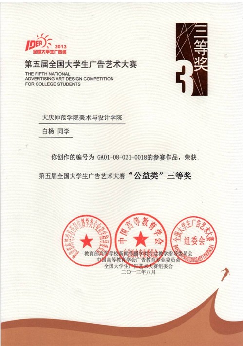 在获全国等级奖的393件作品中,黑龙江赛区获8件,我校获2件,成为兄弟院校中的佼佼者。美术与设计学院青年教师陆津指导的设计作品《中国情》(作者:2010级艺术设计专业学生白杨)和《锦江国际新城》(作者:2011级艺术设计专业学生刘文阳)分获全国大学生广告艺术大赛公益类三等奖和平面类三等奖。学生在本次全国性的比赛中获奖,是学院在该项赛事上的历史性突破,是美术与设计学院专业建设和人才培养的重要成果,也为今后我校环境设计专业和视觉传达专业的长足发展奠定了良好的基础。