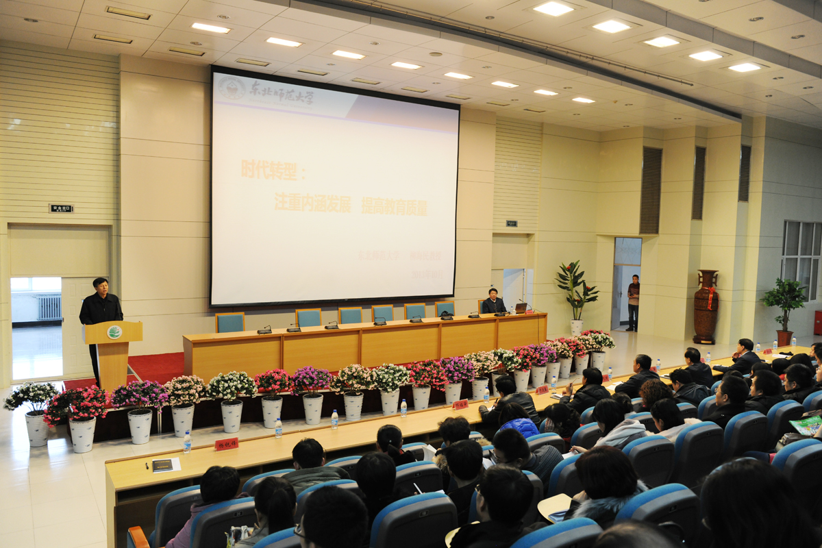 柳海民教授在报告中从国际国内高等教育态势、未来十年的核心任务、国家的改革动向及新一轮教学评估四个方面凸显了高等教育时代转型的内涵与质量主题。报告重点指出,应提高危机意识,加强自我评估,抓住提高人才培养水平的着力点,突出专业特色、优势、竞争力的培养,促进教学、科研协同育人,努力在教师队伍建设等关键环节和体制机制上寻求突破,增强活力。报告高屋建瓴,深入浅出,对于全校上下把握时局,将学校、事业、个人发展融入社会发展起到重要的引领作用。