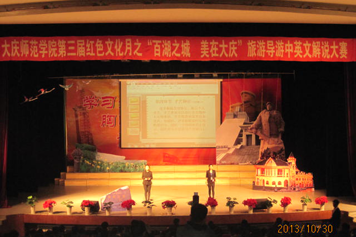 10月30日晚,由校党委学工部、校团委主办,经济管理学院、外国语学院承办的第三届校园红色文化月活动“百湖之城 美在大庆”旅游导游中英文解说大赛在大学生活动中心隆重举行,经过前期激烈的初赛和复赛,共有8名选手站到了决赛的舞台上。