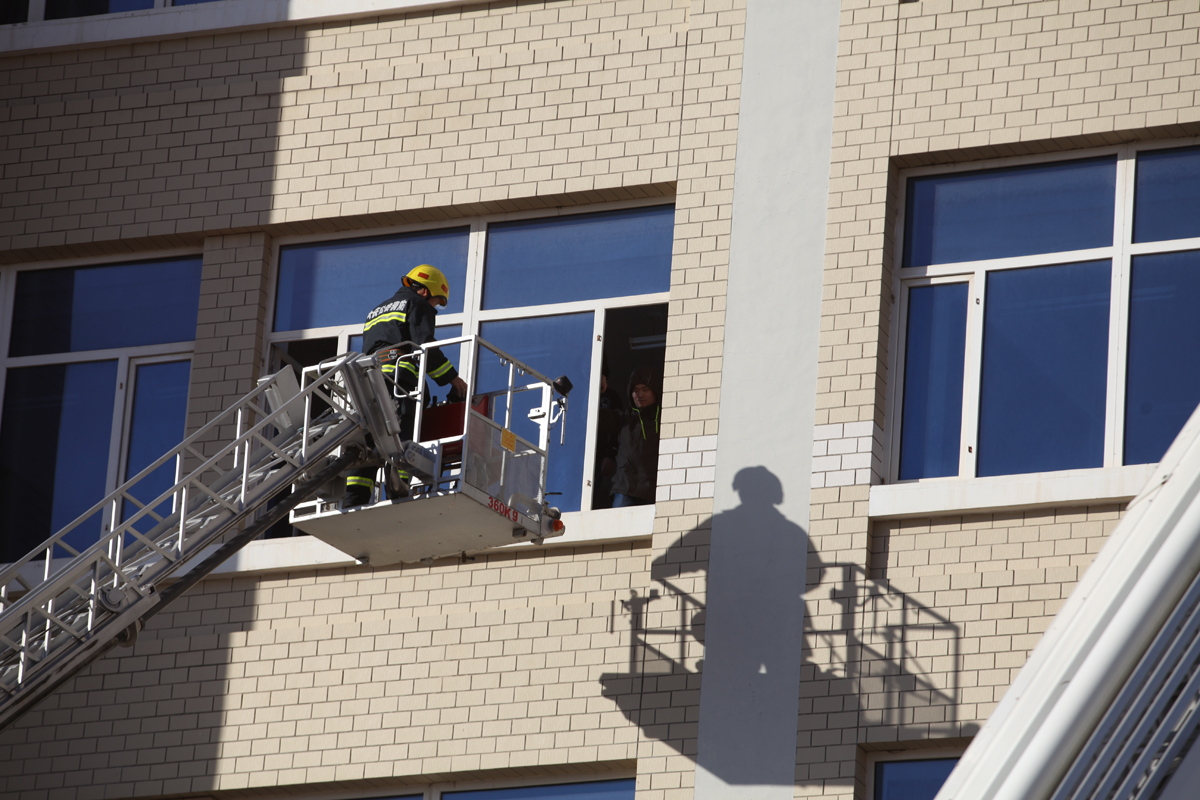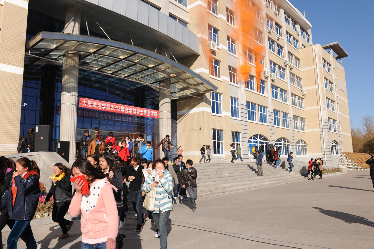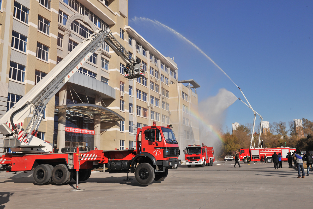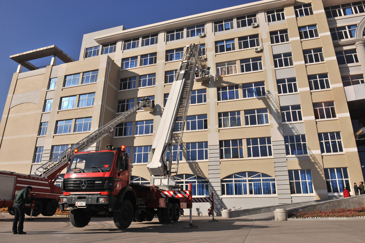 在综合教学楼的四楼和五楼教室窗台,有被困者挥舞手臂请求救援,大庆市公安局消防支队的两辆登高平台消防车载着消防队员实施了高空救援,成功将被困者解救,油田公司消防特勤大队的举高喷射消防车也对过火教室进行了喷水灭火演练。