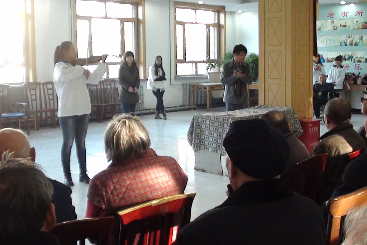 在活动大厅,志愿者们为老人们表演了精心准备的节目。《甜蜜蜜》的婉转旋律,让老人身感温暖;悠扬的小提琴演奏如一泓清泉潺潺流淌在老人心中;河南豫剧、黄梅戏,更是让老人们拍手叫好。