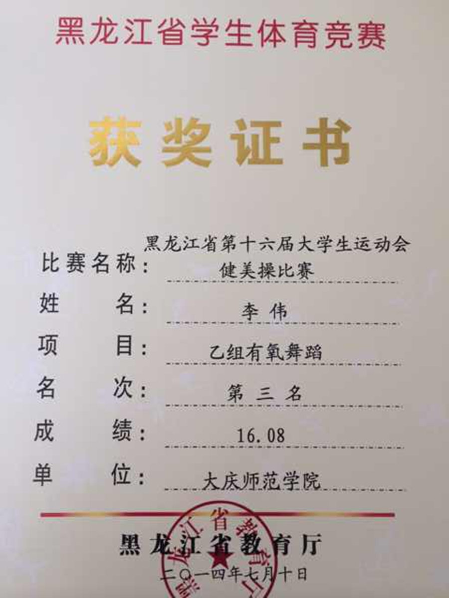 在健美操比赛中,我校健美操队获乙组总分第四名,有氧舞蹈和竞技健美操五人操分获两枚铜牌, 实现了单项奖牌的突破,女子三人操获第五名,男子单人操、女子单人操和混合双人操分获第六名。