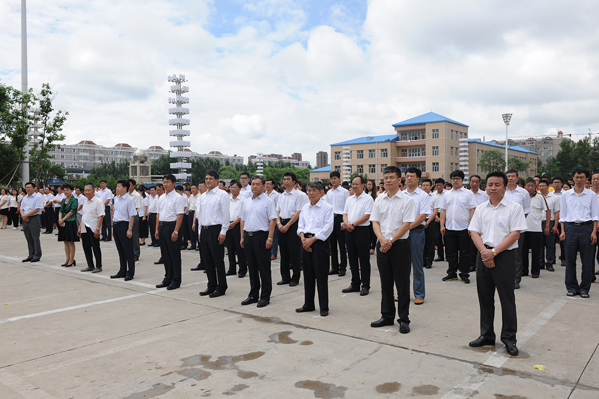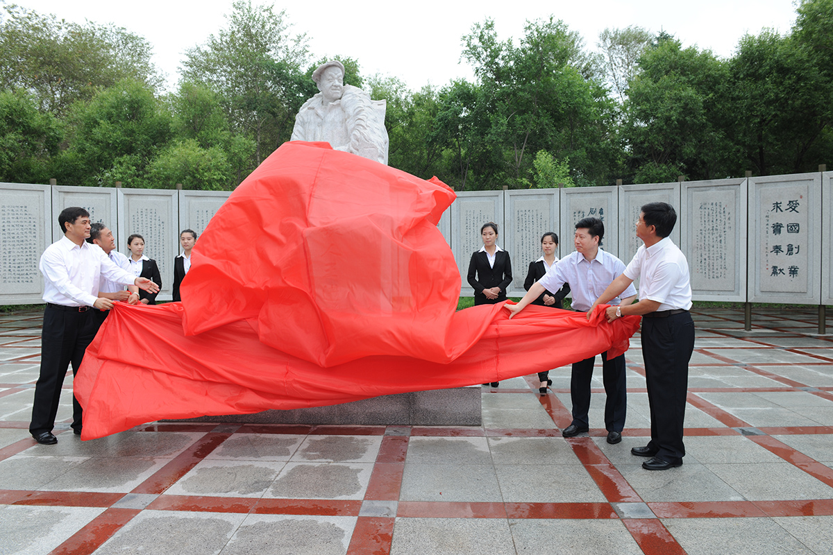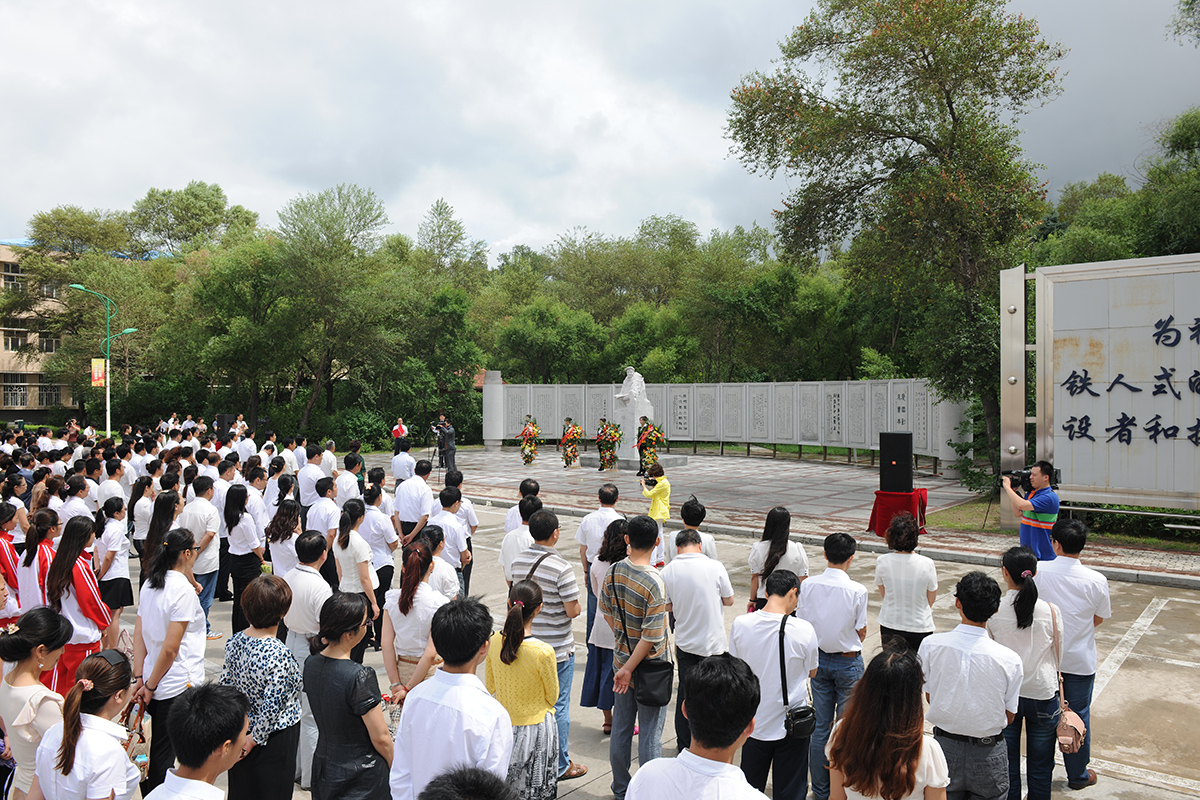 上午十时三十分,1000名师生代表列着整齐的方阵站在铁人雕塑前,绵绵的细雨为整个会场平添了一份肃穆。在激昂的《踏着铁人脚步走》的乐曲声中,“铁人”王进喜塑像揭幕仪式正式开始。
