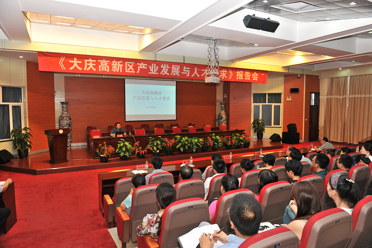 报告会上,董圣慧总经济师详细介绍了大庆高新区产业发展现状、未来10大产业发展趋势及人才需求结构。他充分肯定了我校向应用技术型转型发展的目标,建议我校在人才培养模式、提高专业建设与行业、企业以及区域经济社会发展的契合度等方面,要围绕大庆高新区的“三主三高”现代产业体系框架来构建专业随地方产业发展动态调整的机制。通过高新区管委会这个平台,探寻我校与高新区企业校企合作方式,逐步实现专业设置与产业企业岗位需求对接,课程内容与职业标准对接,教学过程与生产过程对接的人才培养模式,提升我校人才培养质量。