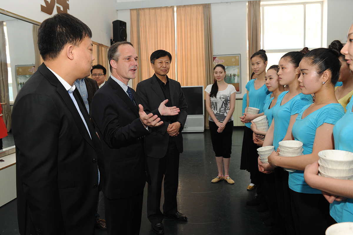代表团首先观摩了我校舞蹈专业课堂教学,参观了学前教育专业实验室和油陶作品展览室。