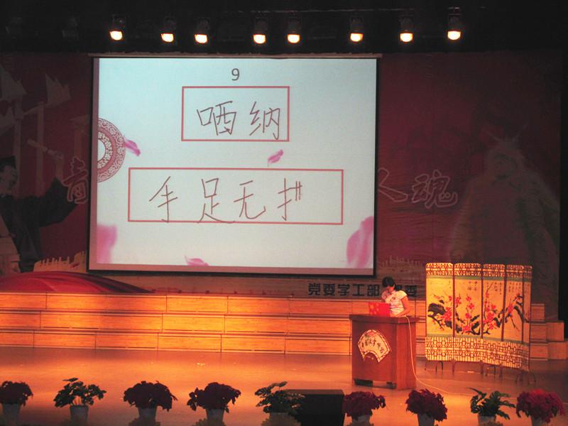 比赛分为个人风采展示、读词、汉字规范听写、互动配音秀四个环节。来自各院系的十二名选手落落大方,反应敏捷,其出色的表现赢得了在场观众的阵阵掌声。其间,评委老师详尽而精彩的点评,也使选手及现场同学们受益匪浅。