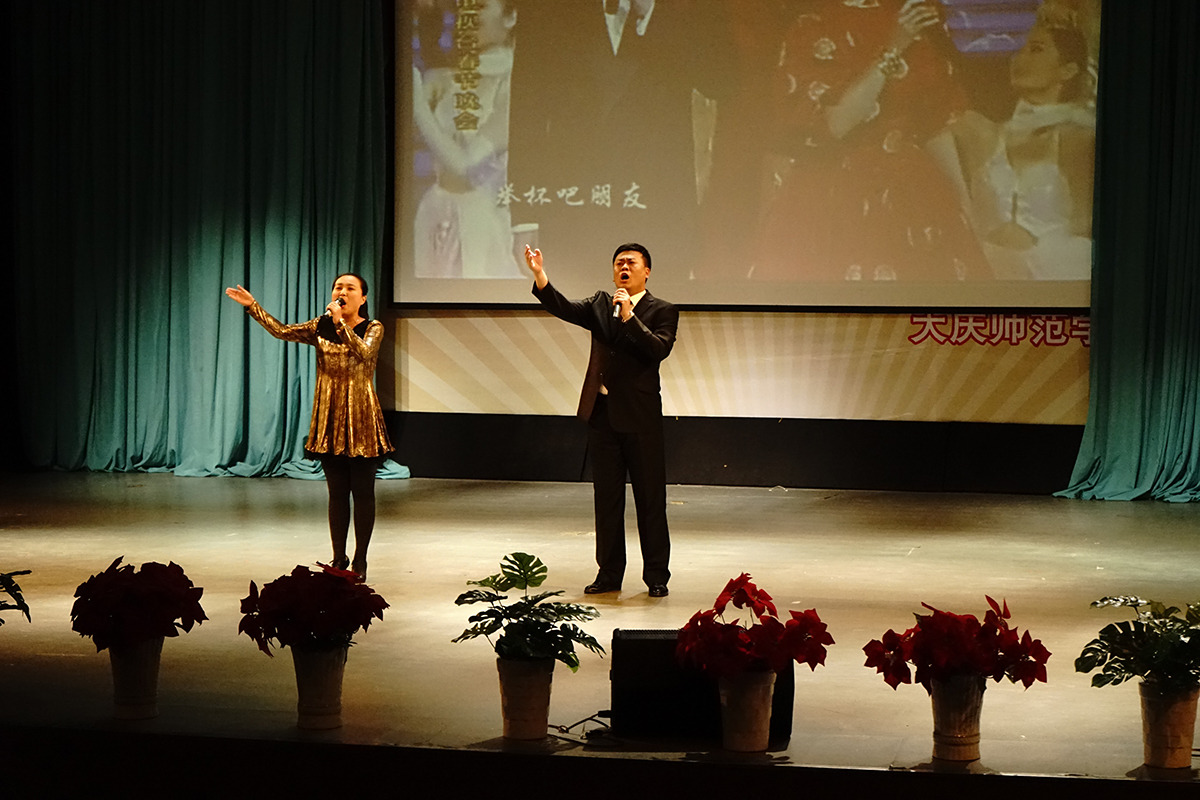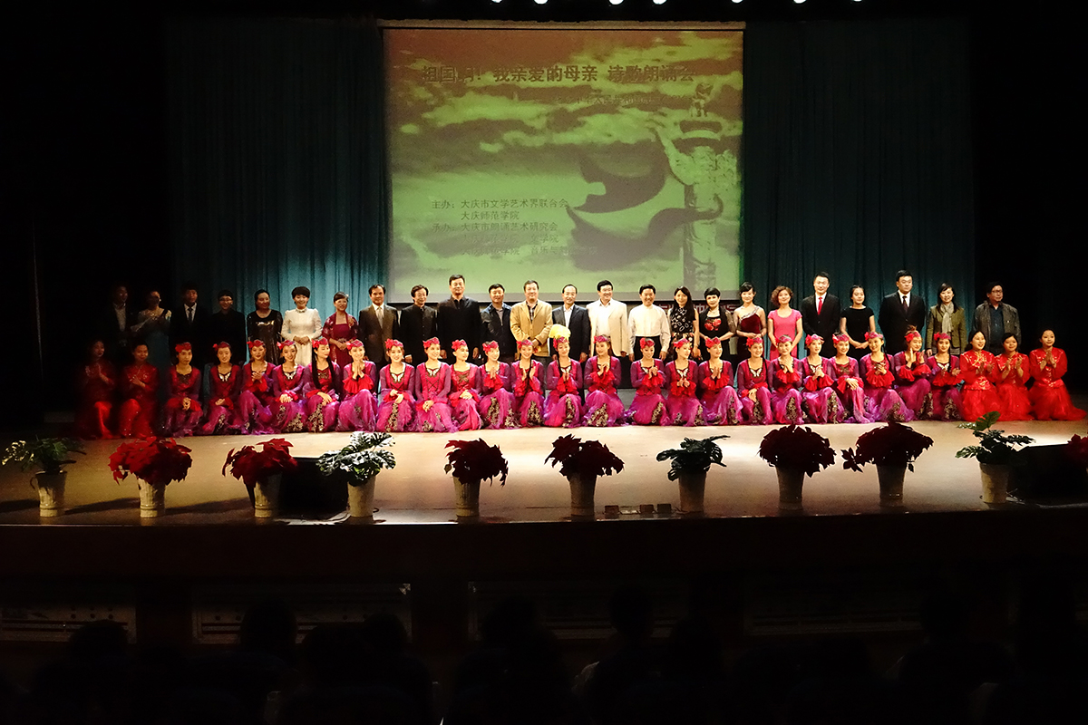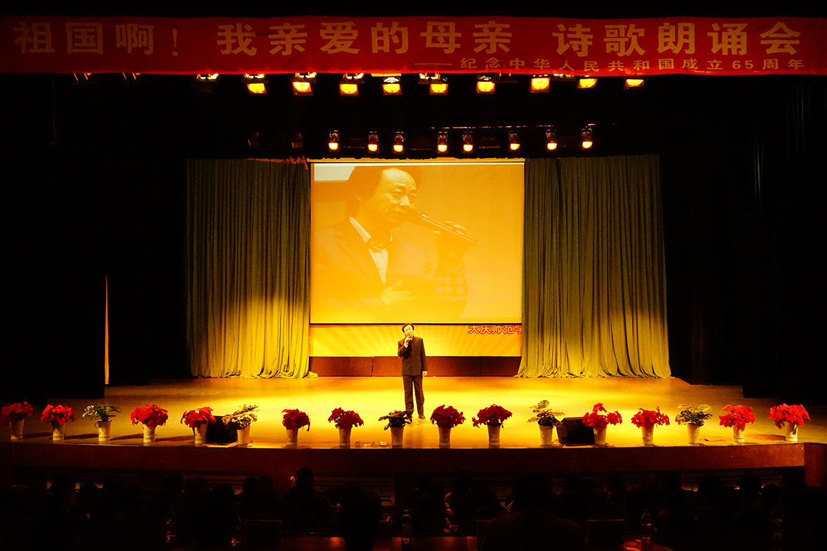 在朗诵会上,来自大庆文学艺术届的艺术家们分别带来了精彩的朗诵,文学院学生孙宇、胡之声、班琳与生命科学学院孙荣鹏同学一起,朗诵了由孙宇同学创作的诗歌《红色旋律,激情飞扬》,他们用真挚的情感表达了作为当代大学生对祖国的热爱。