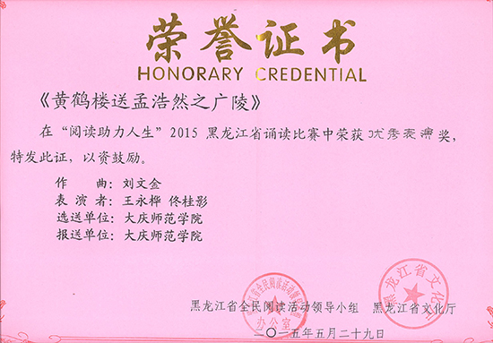 这次诵读比赛共有来自全省各市县、大专院校、部队官兵等35个节目进行了比赛。王永桦、佟桂影参加的展演古诗词歌曲演唱《黄鹤楼·送孟浩然之广陵》以其精彩的表演,古筝与声乐结合的新颖形式,精准的古诗内涵诠释,弘扬传统文化的行动赢得了在场观众的齐声赞扬并获得优秀表演奖,我校获组织奖。