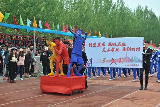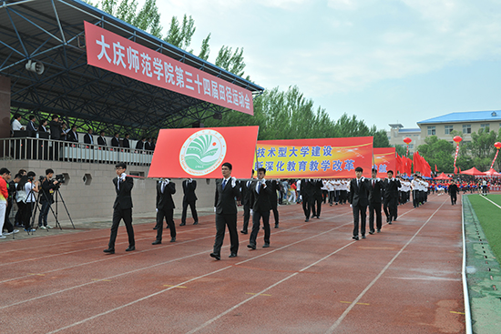 在激昂雄壮的进行曲中,庄严的五星红旗在四名大学生护卫下走在检阅队伍最前方,“紧紧围绕应用技术型大学建设全面深化教育教学改革”、“提高全校师生身体素质为建设应用技术型大学保驾护航”标语牌异常醒目,刀旗队、花束队朝气蓬勃的通过主席台,12个院系,机关、教辅各部门的运动员代表迈着矫健的步伐、喊着响亮的口号,精神抖擞,意气风发的接受学校的检阅。