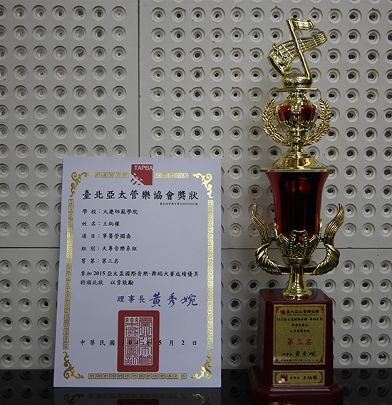 在刚刚结束的“2015台北亚太杯国际音乐、舞蹈大赛”中,我校音乐与舞蹈学院单簧管专业学生王炳权,凭借过人的实力和出色的舞台表现,在历经多轮角逐后,终获单簧管独奏“大学专业组”第三名的好成绩。