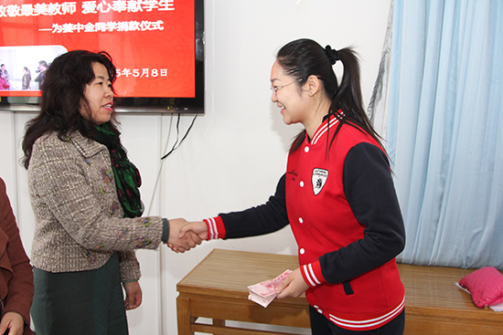 教师代表怀着对姜中金同学的祝福依次捐款,一封封装满爱心的善款投入捐款箱,为姜中金家庭带去了希望。