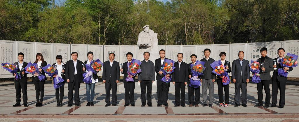会议结束后,校领导与本届“十佳”青年在铁人塑像前合影留念。