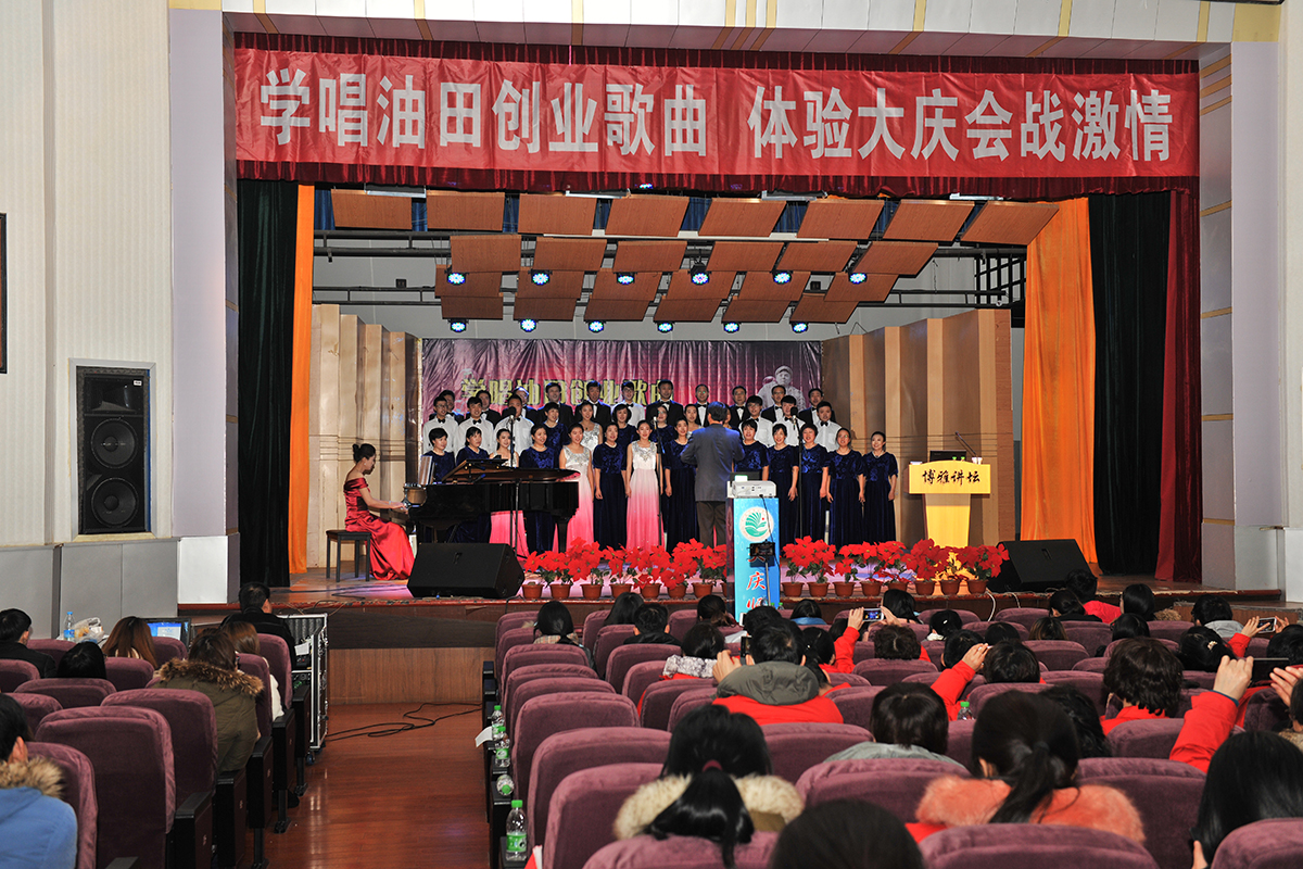随后,主讲教师王永桦教授在学唱歌曲前,按照历史分期,生动地为大家讲述了石油歌曲诞生背后的故事。我校“春之声”声乐俱乐部师生演唱了《石油工人硬骨头》、《大庆的风是创业的风》、《大庆的道路宽又广》、《铁人还在我们行列》、《满怀深情望北京》、《我为祖国献石油》、《再铸时代铁脊梁》等歌曲。老师教唱、学员合唱《踏着铁人脚步走》,将此次激情教学活动推向了高潮。