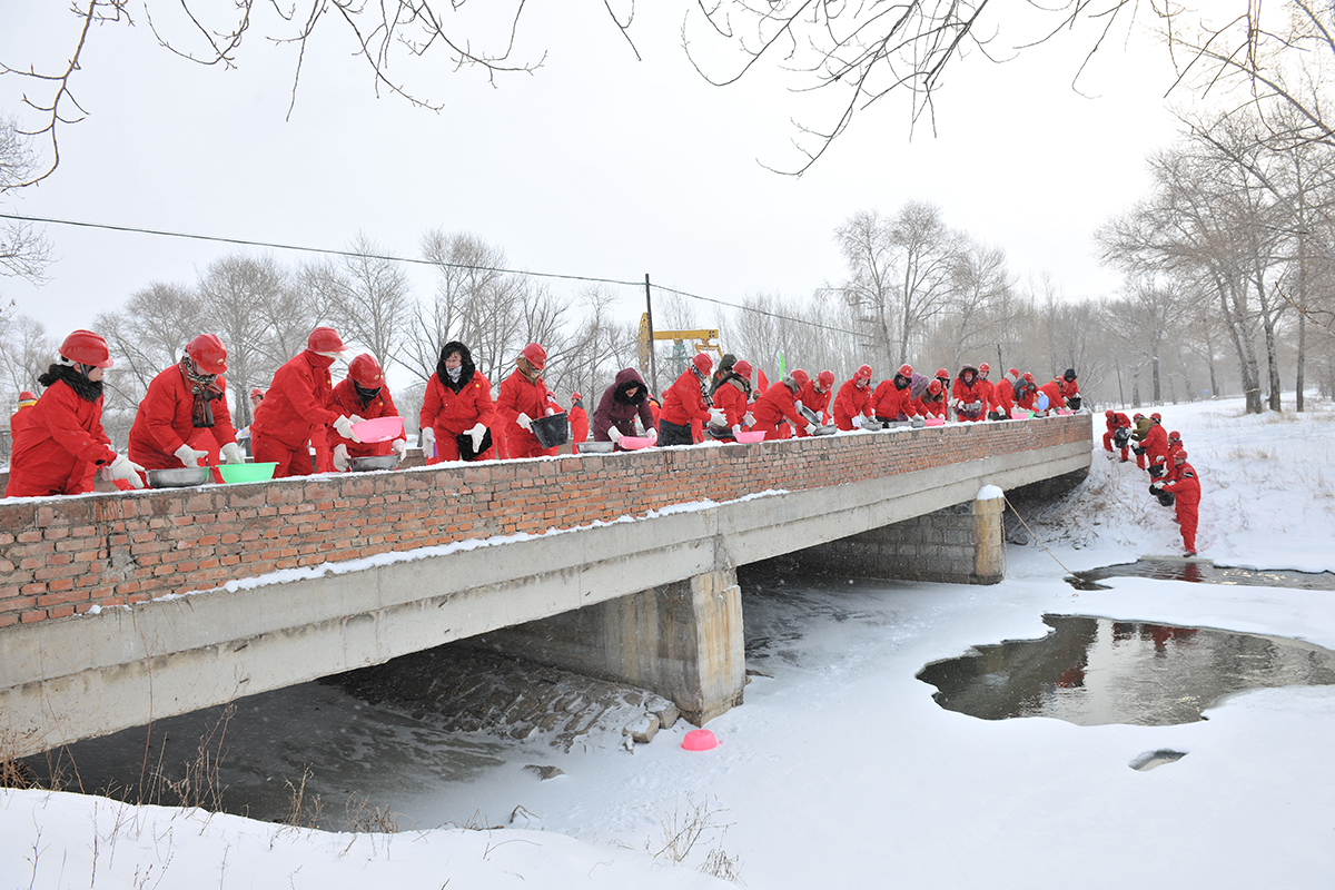 在体验破冰端水打井过程中,学员们冒着严寒在冰天雪地中喊着“石油工人一声吼,地球也会抖三抖”的口号,用镐破冰,用水桶、脸盆端水,感受先辈们“没有条件创造条件”的干劲和智慧。有的学员破冰时一脚踏空,一条腿掉到了河里,冰冷的河水浸透了裤子鞋子,但他始终坚持;运水中河水洒在了学员们的身上腿上迅速结成了冰,可大家始终斗志不减,……全体学员一致表示,通过体验,深深感受到了大庆石油会战的艰辛、会战先辈的无畏和大庆精神的伟大。
