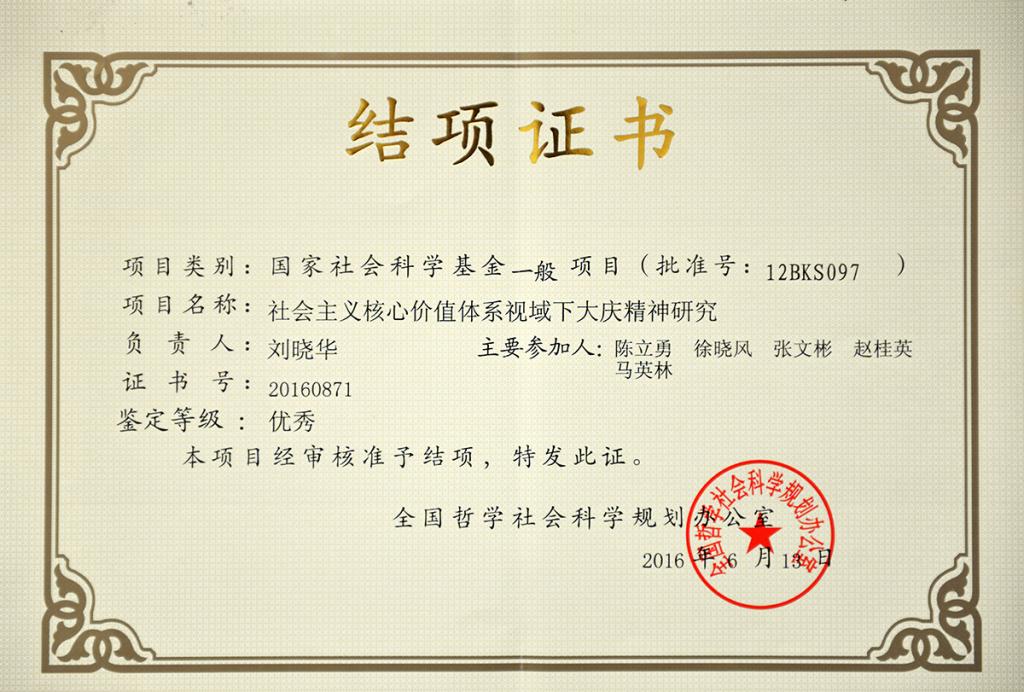 7月1日,全国哲学社会科学规划办公室正式公布2016年6月国家社科基金项目结项成果鉴定等级公告。由我校大庆精神研究基地刘晓华教授主持,陈立勇、徐晓风、张文彬、马英林、赵桂英、闫立光等参与完成的国家社科基金项目《社会主义核心价值体系视域下大庆精神研究》(项目编号:12BKS097)被鉴定等级为优秀。该课题组在《光明日报》《思想理论教育导刊》《学术交流》《理论学刊》等国家重要报纸和学术期刊上阶段性研究成果10余篇,研究成果被多家报纸、网站和电视台等相关媒体转载引用,得到了省市和油田公司相关领导及专家的充分肯定和认可。该课题以大庆精神为主要研究对象和切入点,遵循问题导向,以辩证唯物主义和历史唯物主义为主要研究方法,同时综合运用文献研究、比较研究、口述史研究等方法,对大庆精神的思想来源、理论基础、逻辑理路进行考察,探究新时期大庆精神的多维内涵、时代价值及其传承路径,为新时期培育和践行社会主义核心价值观建言献策。