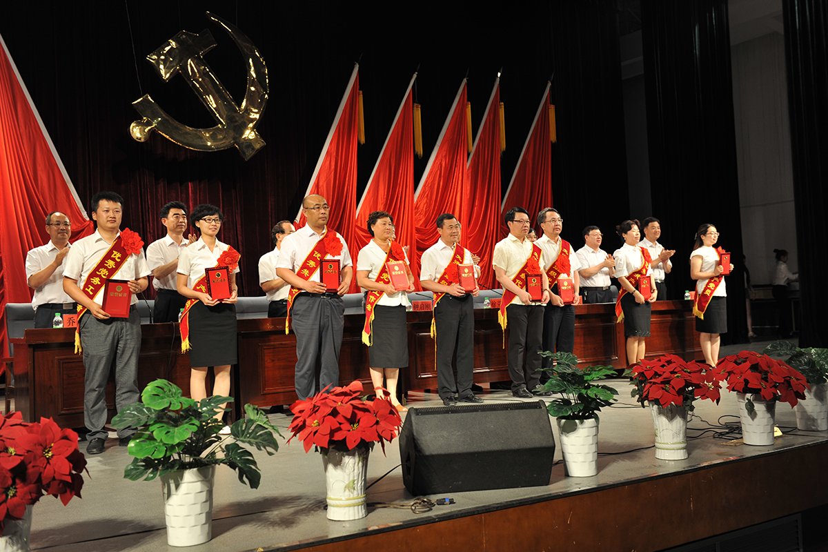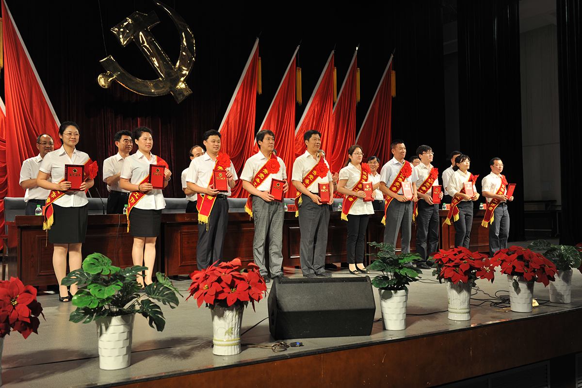 在欢快的进行曲中,校领导为获得省委高校工委、油田党委和学校党委表彰的“先优”代表颁发奖牌和证书。