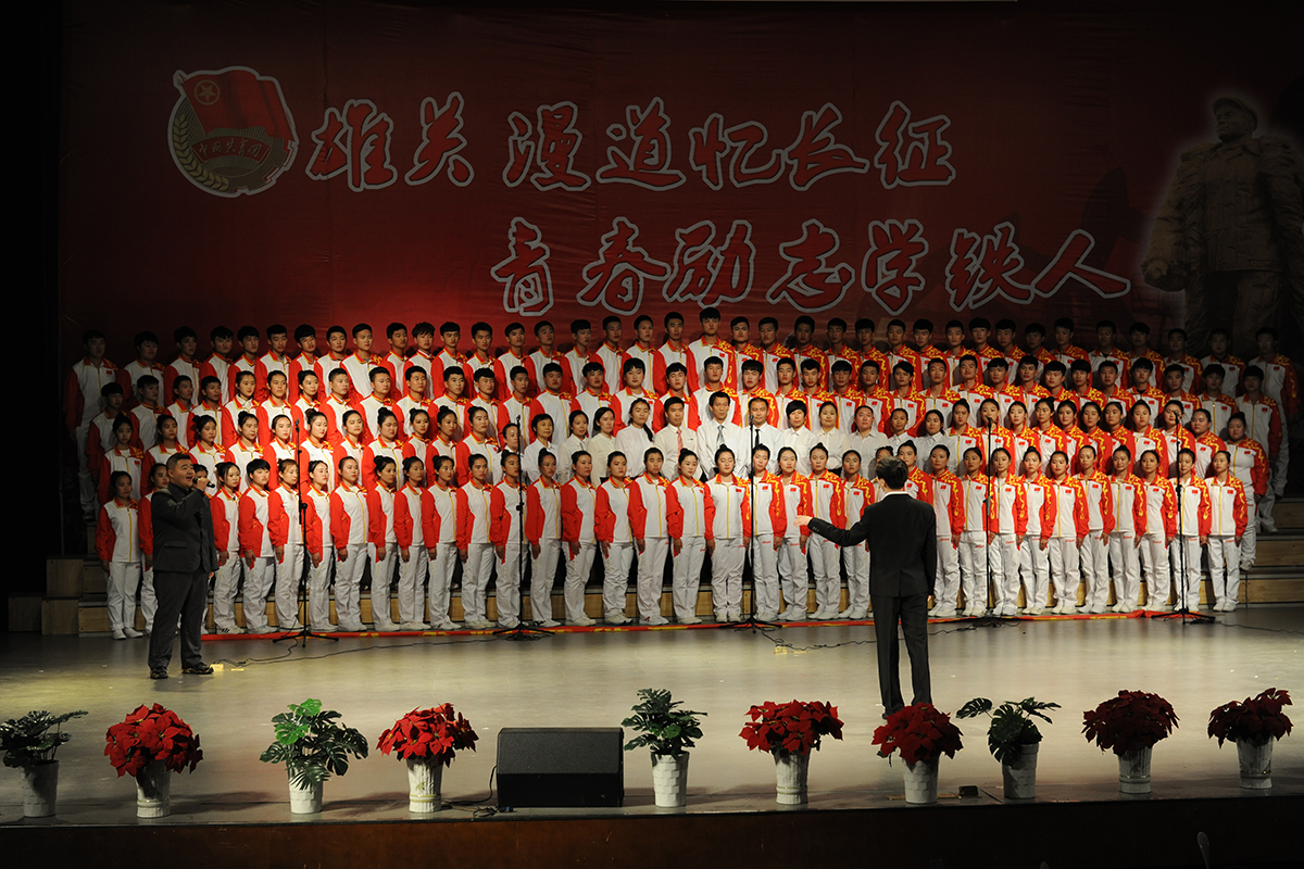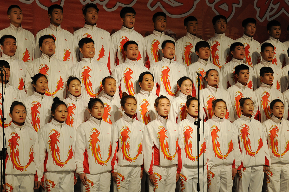 体育学院全体合唱演员士气高昂、用嘹亮的歌喉倾情演唱了《红军不怕远征难》《踏着铁人脚步走》。