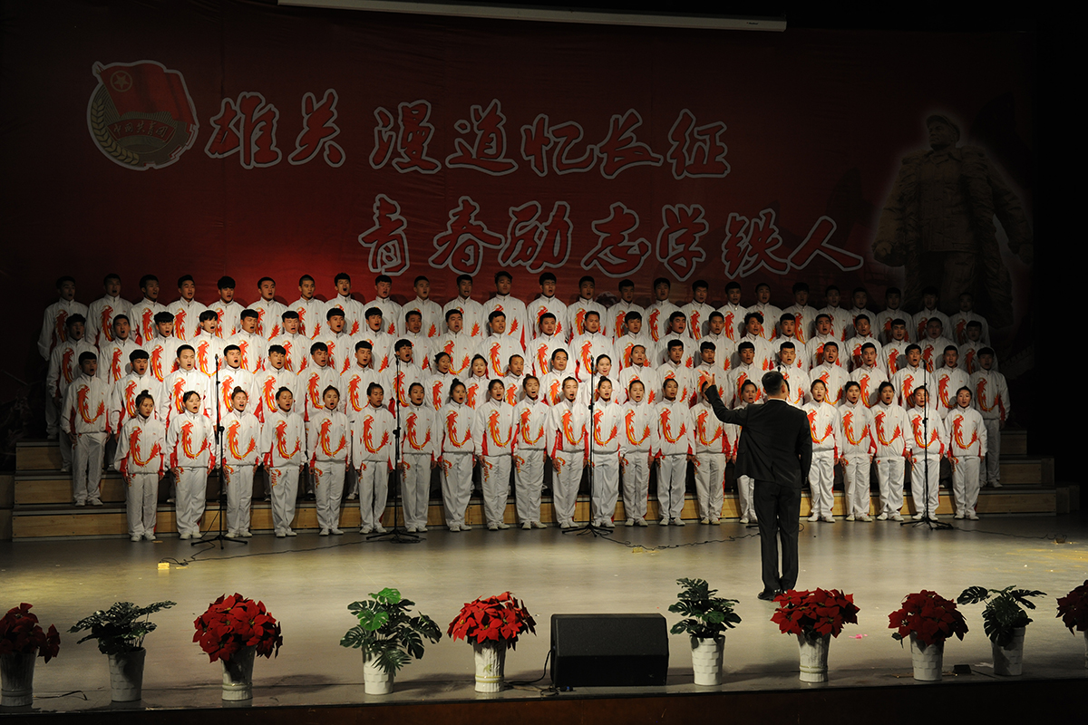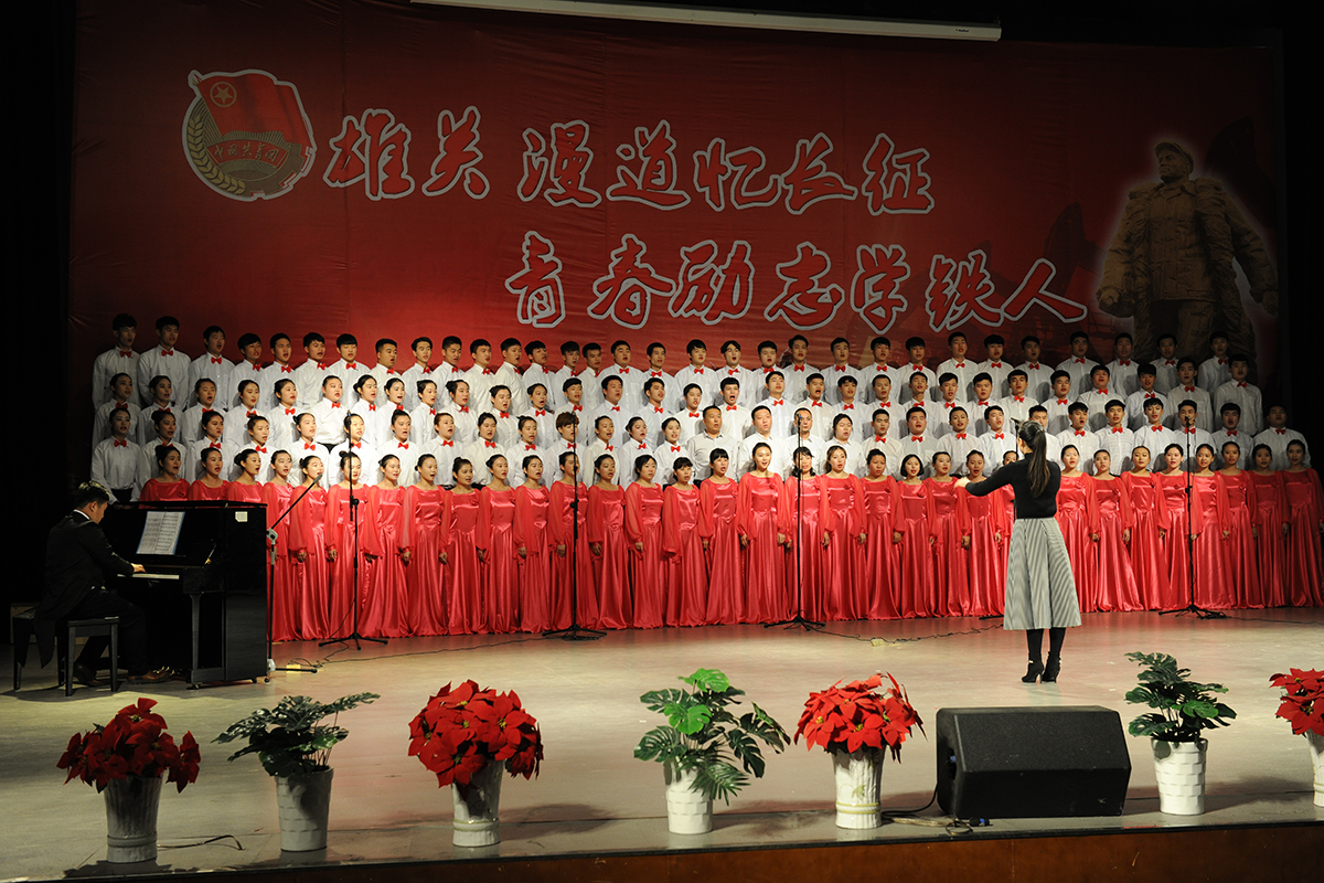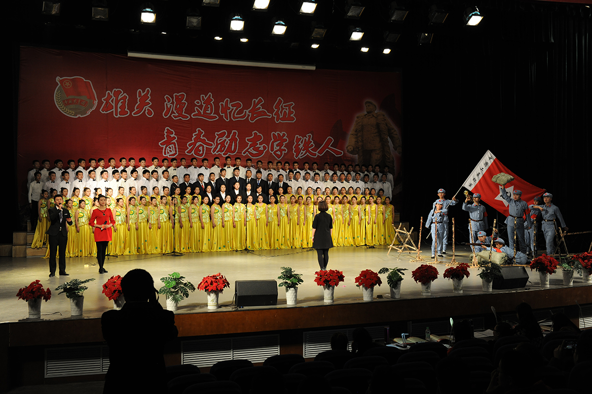 外国语学院的全体演员身着红军服装,激情演唱了《四渡赤水出奇兵》《踏着铁人脚步走》,震撼了全场观众。