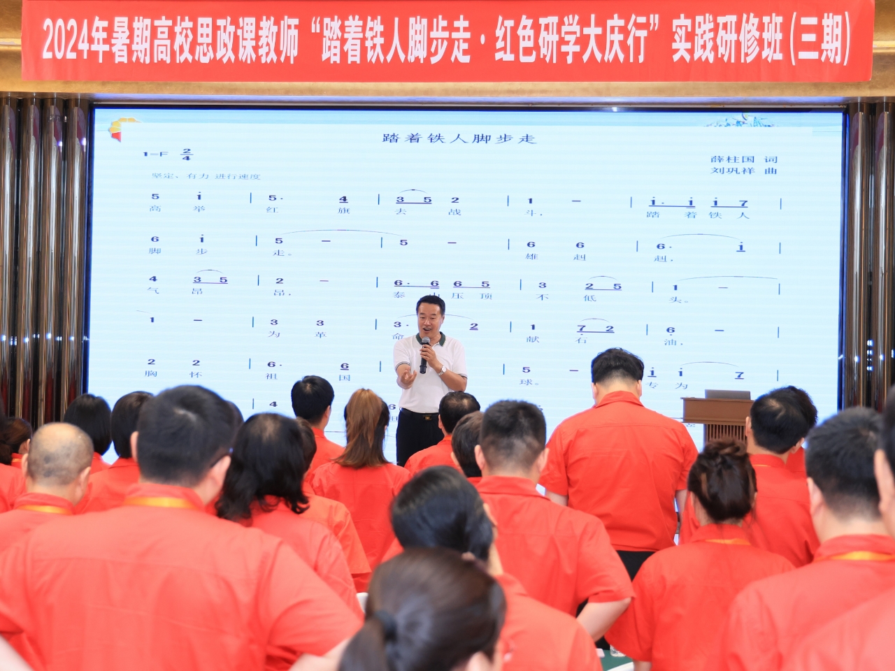 激情教学环节,基地采取现场与沿途相结合的模式,邀请黑龙江省课程思政首届教学名师、中国石油歌唱家王永桦教授,用歌声串联起新中国石油勘探开发的精彩瞬间、演绎出石油歌曲的发展历程、展现了大庆精神(铁人精神)独具特色的传承方式。