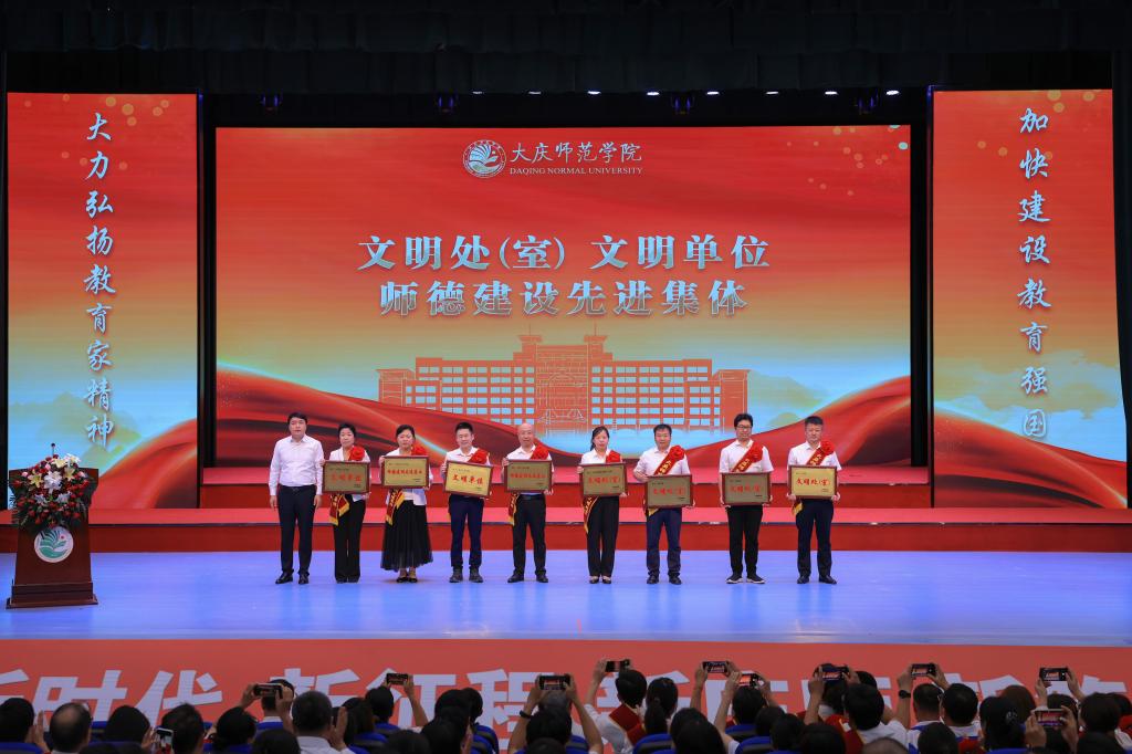 大会在青年学生献词中开场。张平宣读了近两年获得国家级、省级相关奖励情况,以及本年度文明评选、师德先进评选等结果。校领导们为获奖单位和个人颁发奖牌和证书。