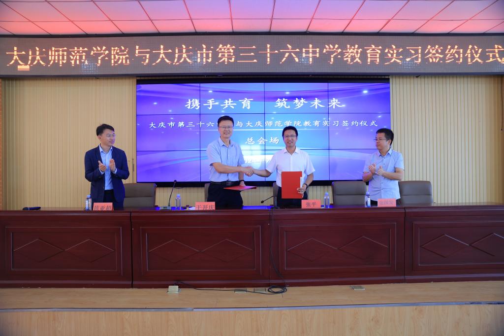仪式后,在张平及参会教师的带领下实习生们前往大庆市第36中学、景园中学、第三中学、第一中学、新潮学校、嘉城学校、北湖学校、西苑小学、让北一小、让北二小等教育实习基地。在大庆市第三十六中学,张平与第三十六中学校长签署了实习协议。这一协议的签订不仅为实习生们提供了稳定的实习平台,也为两校之间的深度合作奠定了坚实的基础。