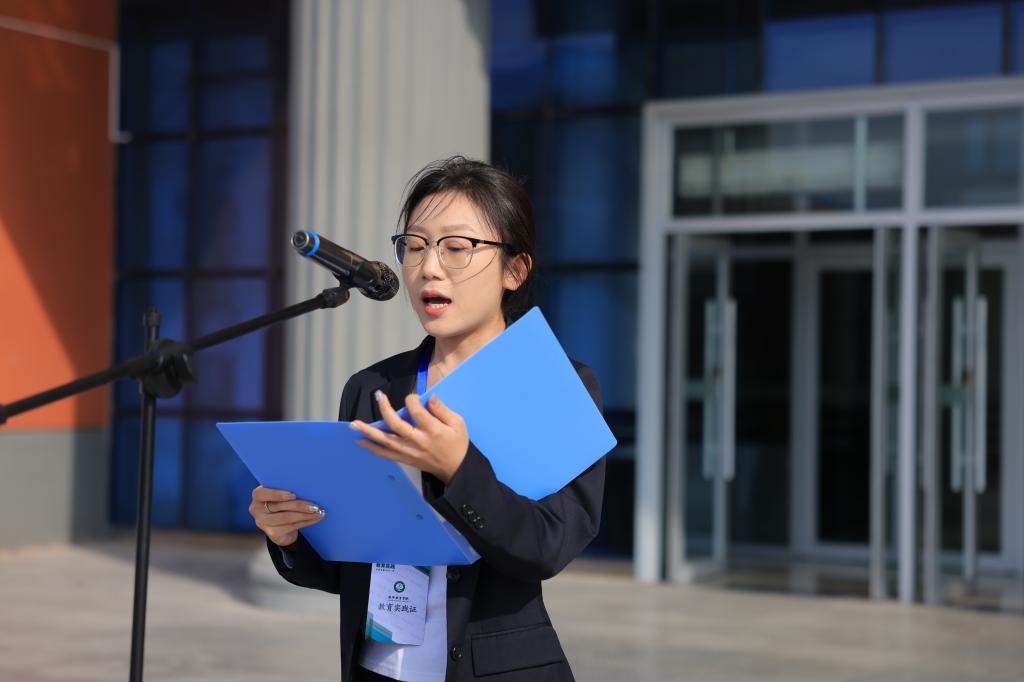 随后,学生代表郑延凤上台发言,她代表全体实习生表达了对学校精心组织此次实习机会的深切感激,对一直以来悉心教导、无私奉献的老师们致以崇高的敬意。她表示,全体实习生将不负众望,以饱满的热情、严谨的态度投入到实习工作中,积极面对挑战,勇于实践创新,努力成为一名合格的人民教师。同时,她也表达了对未来教育事业的无限向往和坚定信念,承诺将对学生负责,用心用情去关爱每一位学生。