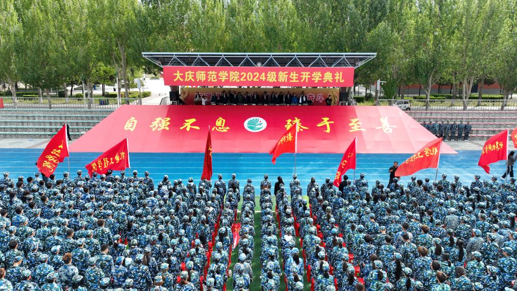 校长张平致辞,为全体新同学上了别开生面的一堂思政课。他代表全校师生对3519名新同学的到来表示热烈欢迎,他指出,大学是人生旅途中一个璀璨夺目的篇章,不仅是知识的殿堂,更是梦想启航的地方。他对2024级全体新生提出三点希望:一是做堪当民族复兴重任的庆师人,要厚植家国情怀。要传承弘扬大庆精神(铁人精神),勇担“强国有我”的时代重任,在传承中创新,在创新中超越,将个人成长的小志趣融入国家发展的大潮流,既要仰望星空又要脚踏实地,勇做堪当大任、不负时代的强国青年。二是做堪当民族复兴重任的庆师人,要锻造自立自强。要学会学习、坚持思考,注重系统化的学习和学与思的结合,通过艰辛的思考,形成独立的人格、自由的意志、严谨的思维框架和缜密的逻辑体系。三是做堪当民族复兴重任的庆师人,要练就过硬本领。既要扎实掌握本学科的专业知识和技能,也要培养跨学科交叉融合的创新思维和能力,真正做到一专多能。希望同学们秉持“自强不息、臻于至善”的校训,在脚踏实地中矢志追求卓越,在躬耕实践中练就过硬本领,在锐意创新中勇攀人生高峰,做堪当民族复兴重任的庆师人。
