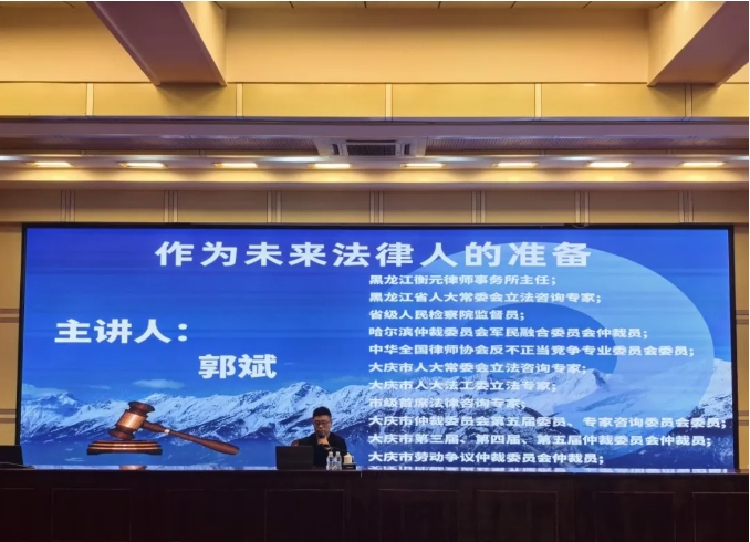 仪式结束后,大庆律师协会副会长郭斌为与会学生作了专题讲座。